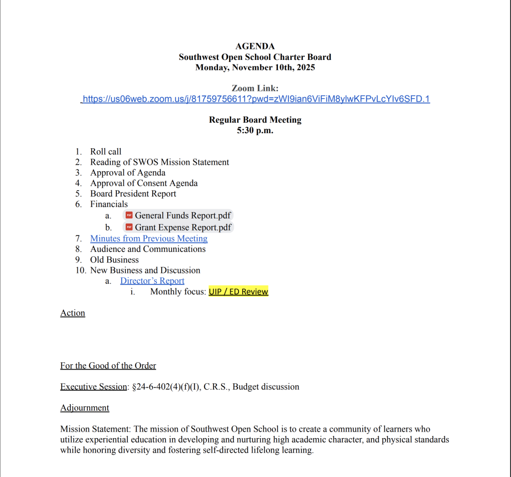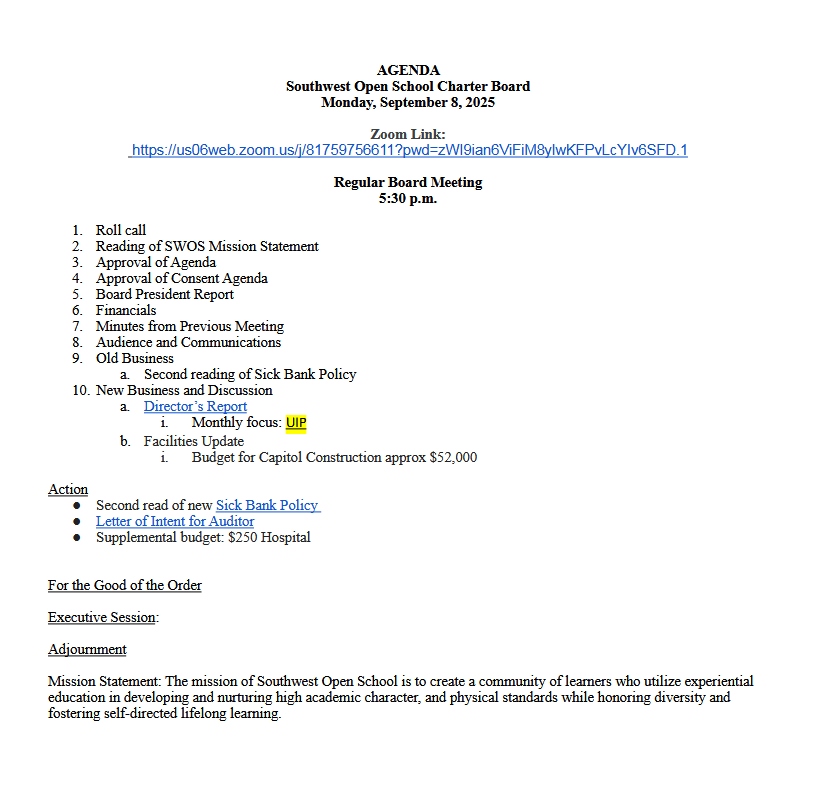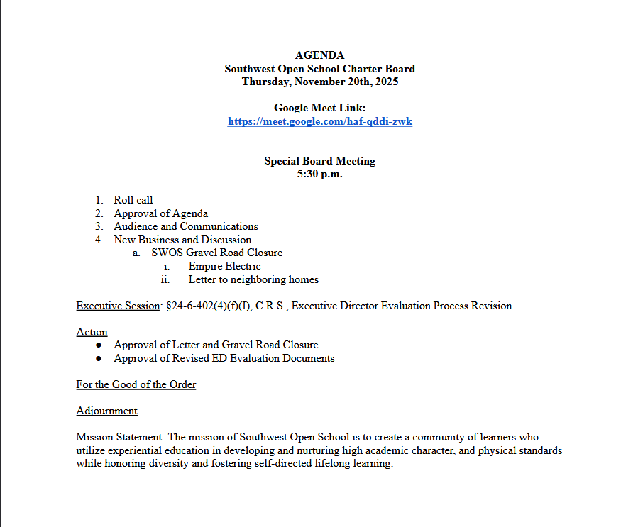 The Southwest Open School Board will conduct their regular monthly board meetings, every second Monday of every month, unless otherwise posted. The meetings remain open to the public. Please visit our calendar for more details.